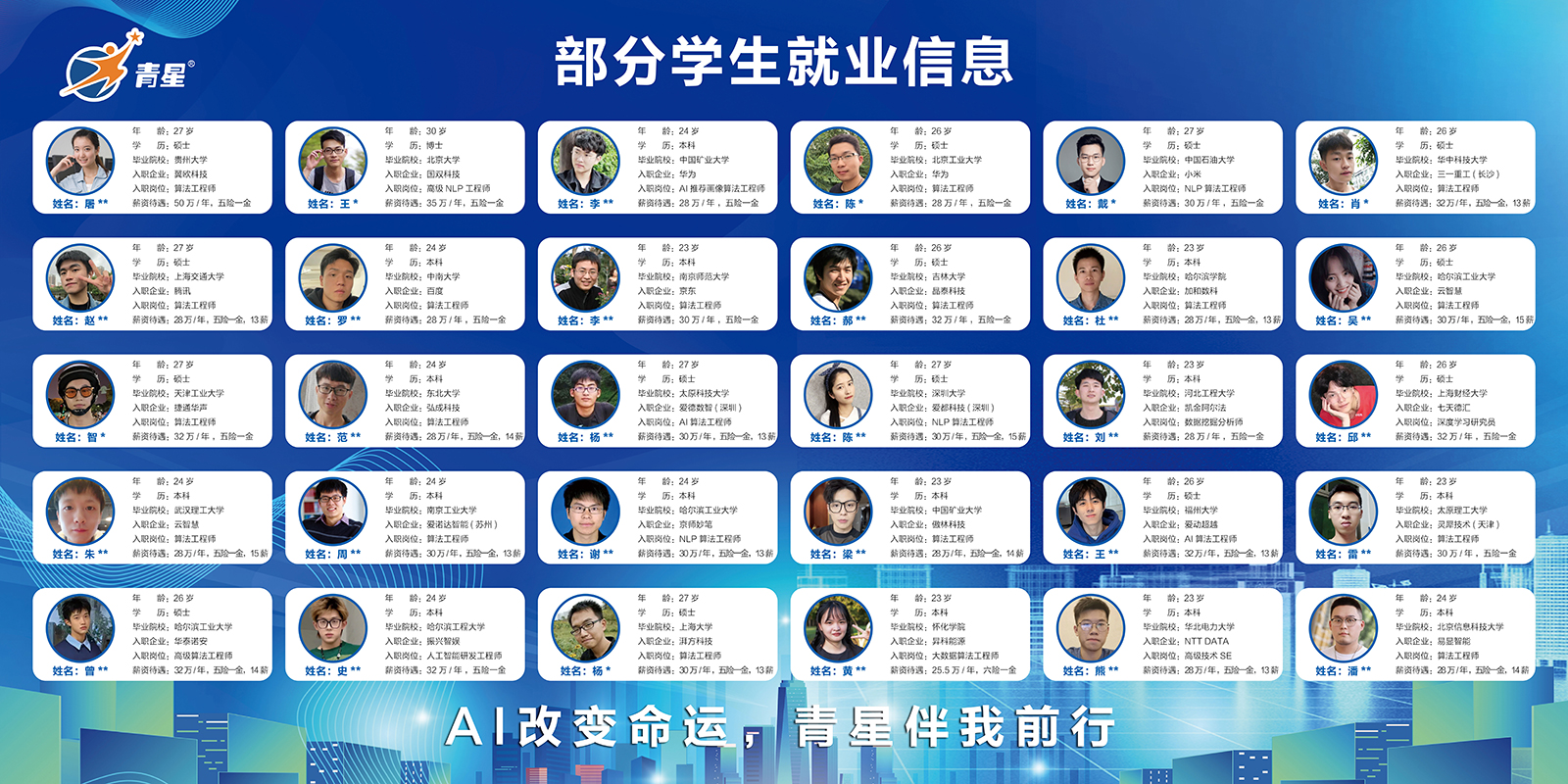 谢同学,2023年3月开始在青星教育学习,2023年6月北京大学本科毕业,2023年8月入职某金融+AI公司,算法工程师P3级别,月薪18K,16薪